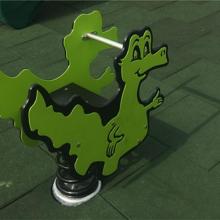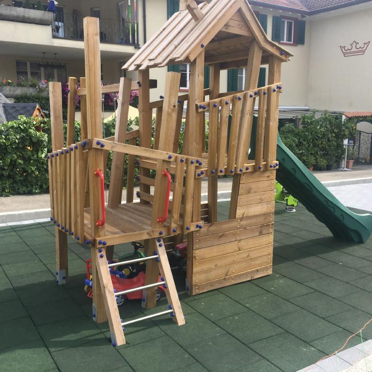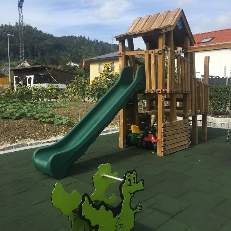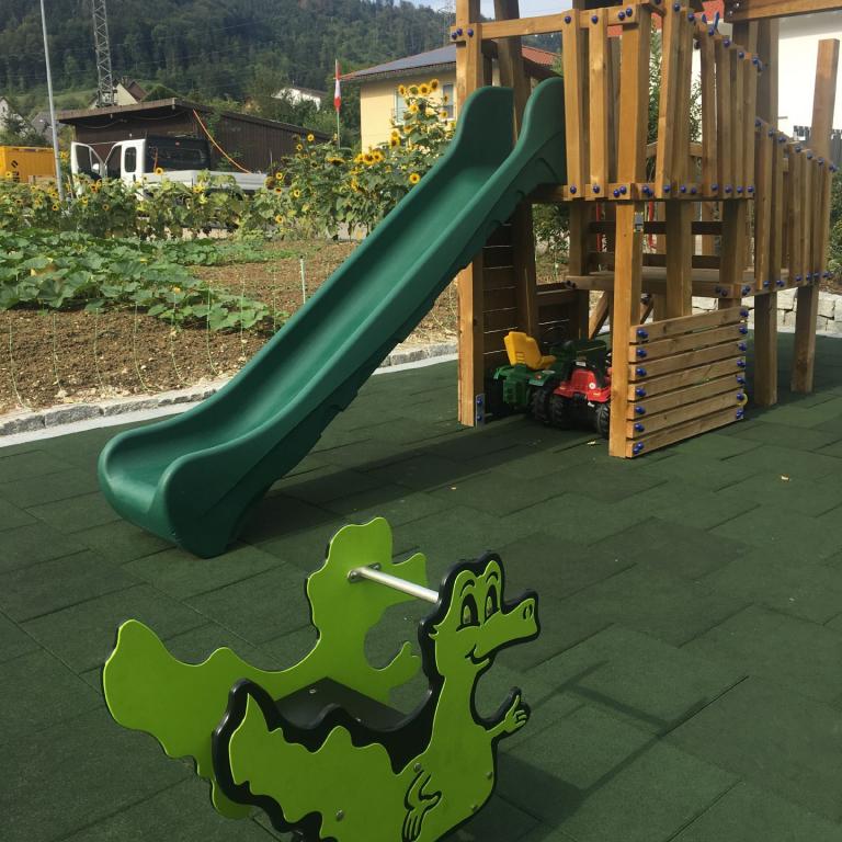 Der Spielplatz ist nach EN 1176 gebaut und sind mit grünen Fallschutzmatten ausgestatet für möglichst grosse Sicherheit